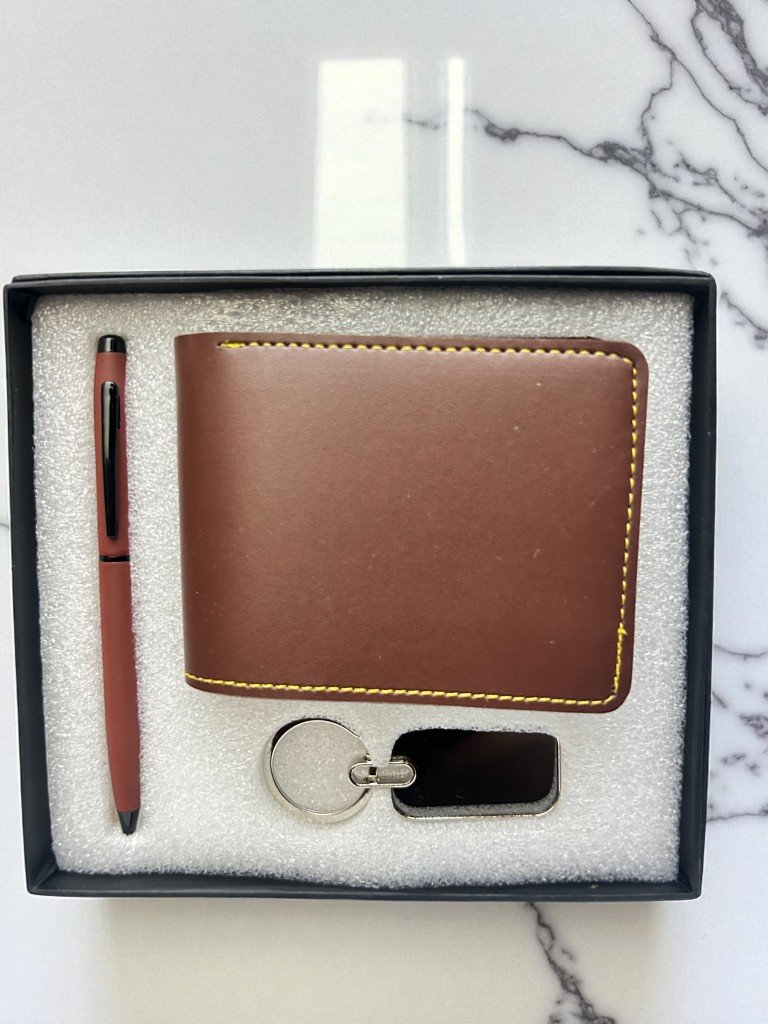 Elevate your gifting with this elegant Dark Brown Wallet Gift Set, featuring a sleek wallet, matching metal pen, and a premium keychain—all beautifully packaged in a sophisticated gift box. Designed to offer both function and style, this trio is perfect for special events, milestone moments, or corporate recognition.