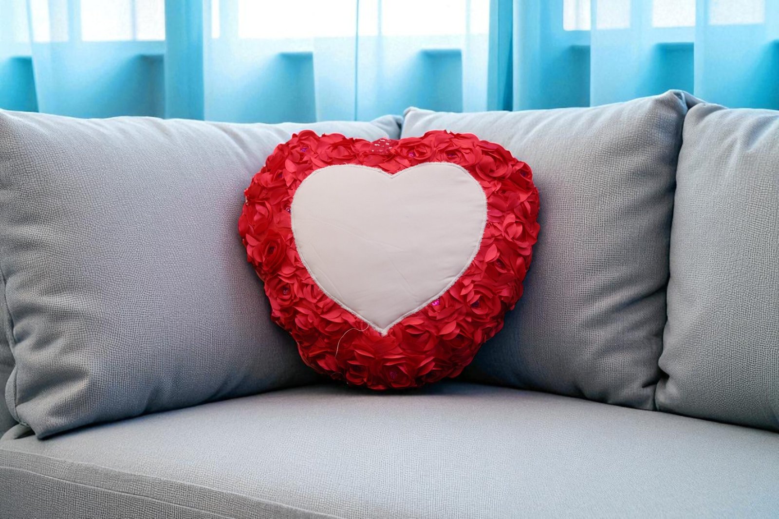 Beautiful heart-shaped cushion with pink rose petal trim and your personalized photo printed at the center. A soft, romantic gift for special occasions.